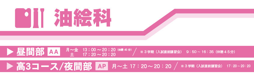 油絵科昼間部は一人一人の目標に合わせて、細やかで丁寧な対応を心がけています。個人面接を指導の根幹にし、目標をクリアしていくためにバラエティーに富んだカリキュラムを生徒の個性に合わせて用意しています。授業は、それぞれが理解できるまでしっかりとコミュニケーションをとって進めていきます。少人数制のクラスだからこそ、きちんと一人一人を丁寧にケアして生徒の目標を確実に達成させることが出来るのです。30 年以上の歴史の中で、合格率はもちろんのこと、夢を形にできた満足率はムサ院の油絵科がどこよりも一番です。