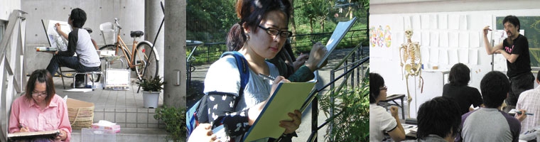 時には屋外に出てのびのびと絵を描くことも必要です。近くの公園や山、川に出かけて、興味深いモチーフや絵になるアングルを探してスケッチしたり、動物園での動物クロッキーで動きのある美しいラインを見つけたり‥‥。屋外授業は、普段アトリエでは得られない新鮮さを発見をするチャンスです。
